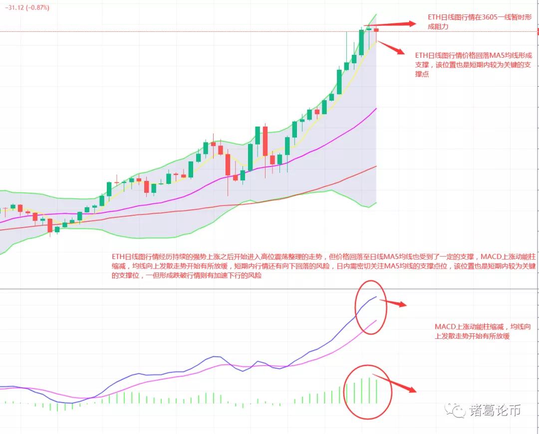 ETH在经历了持续的强势上涨之后开始进入高位震荡整理的走势,技术形态MACD上涨动能柱缩减,均线向上发散走势开始有所放缓,行情价格上方3605一线形成短期的阻力压制,短期内行情还有一定向下回落的风险,整体来看ETH回落在MA5均线受到较为明显的支撑,该位置也是短期内较为关键的支撑点位,一但价格形成有效跌破该位置的形态,行情则有加速下行的风险,所以近期需密切关注行情回落至该位置时的形态变化。