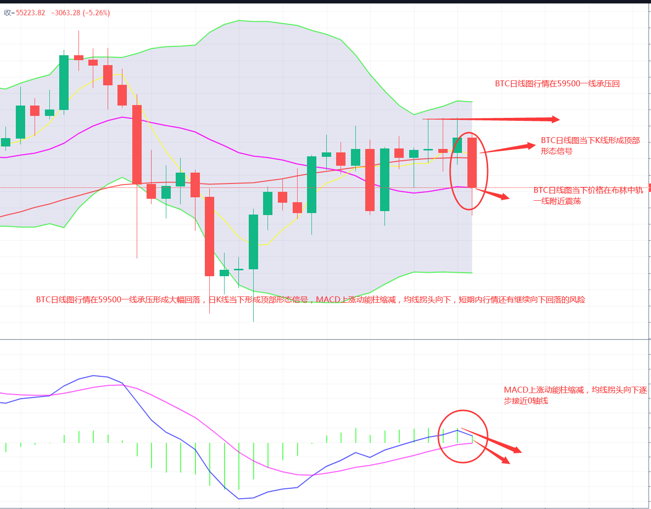 BTC日内行情在快速杀跌后形成小幅反弹上涨,但行情反弹力度较弱当下行情价格围绕在布林中轨附近震荡,技术形态日线图MACD上涨动能柱缩减,均线拐头向下逐步接近0轴线,短期内还有继续下行的风险,整体形态BTC日线图K线跌出顶部形态信号行情价格当下也跌破MA5均线的支撑,如行情不能在近两日快速反弹回归至MA5均线的上方,那么行情反弹之后大概率还将会承压继续向下甚至有可能形成大周期的第4浪调整,所以近阶段操作上需要谨慎切不可盲目的进场抄底,当还是多以短线操作为主时刻注意风险控制。