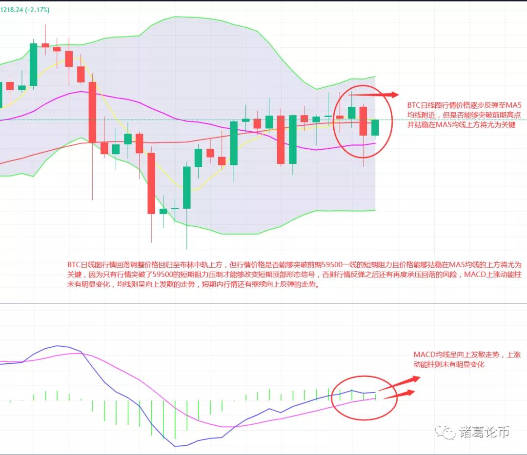 BTC行情反弹至布林中轨的上方,但还未能突破MA5均线的短线阻力压制,技术形态MACD上涨动能柱未出现明显变化,均线则呈向上发散的走势,短期内行情还有继续向上反弹的走势,但量能较低上涨动力有所不足,整体来看BTC行情虽然形成反弹走势,但价格还未能突破前期59500的阻力,且行情也还未回归至MA5均线的上方,因为只有行情价格有效的突破59500的短期阻力压制且站稳在MA5均线上方才能够改变短期顶部形态,在行情还未形成突破之前还有一定反弹承压回落的风险,所以日内需密切关注行情向上反弹的形态走势变化。