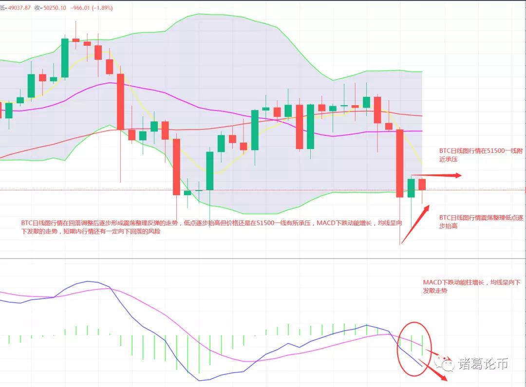 BTC行情在回落调整后逐步形成震荡整理反弹的走势,价格回落的低点逐步抬高但在51500一线形成了短期的阻力压制,技术形态日线图MACD下跌动能柱增长,均线呈向下发散的走势,短期内行情还有一定向下回落的风险,整体来看在BTC价格未能有效的突破并站稳在日线MA5均线的上方时,行情依然还是处于空头的走势格局之中,行情反弹后依然还有承压大幅回落的风险,所以近阶段操作还是需要密切注意行情反弹至上方阻力压制区间是否出现承压形态,以及回落下方支撑位是否能够形成有效支撑。