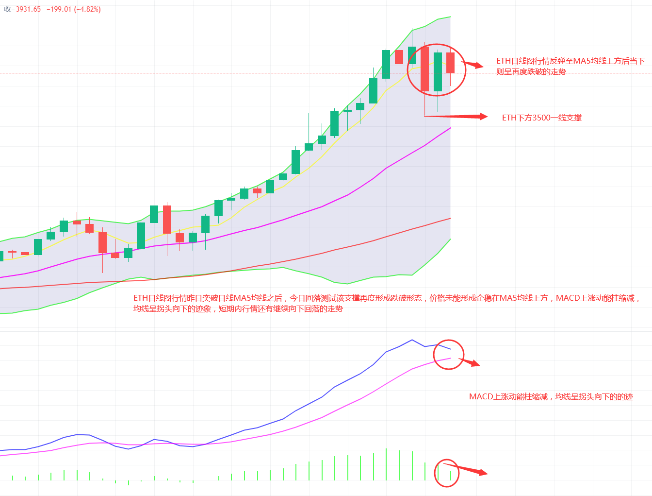 ETH行情昨日形成突破MA5均线的形态,但今日回落测试该支撑则再度形成跌破形态,行情价格未能形成企稳在该支撑位上方,技术形态MACD上涨动能柱缩减,均线呈拐头向下走势,短期内行情还又一定向下回落的风险,整体形态ETH短时期小时图行情下跌至3800一线形成反弹,K线走出底部形态信号行情价格短时期还有向上反弹的走势,但如价格日内收盘时段未能从新回归至日线MA5均线的上方,则代表昨日的突破形态为假像突破,短期内行情反弹之后还将会极大概率的延续向下回落的走势。