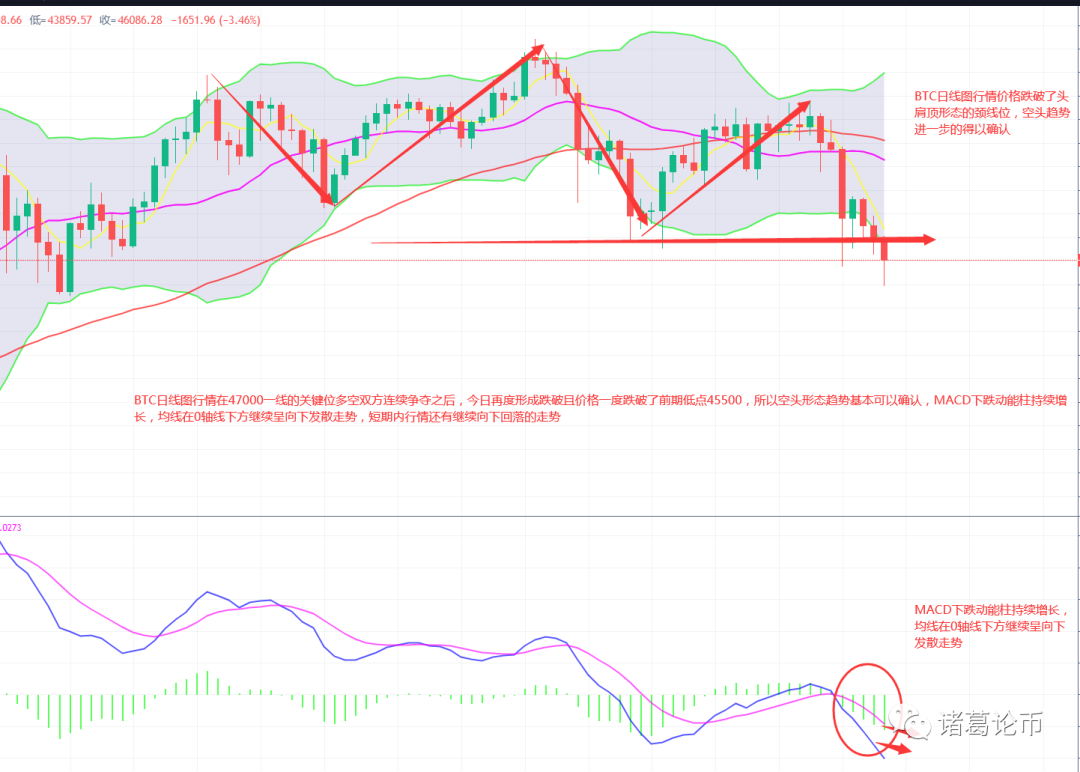 3、略激进者可在BTC反弹至46500一线附近介入空单,止损47000上方,目标看至45500-44000区间附近。
