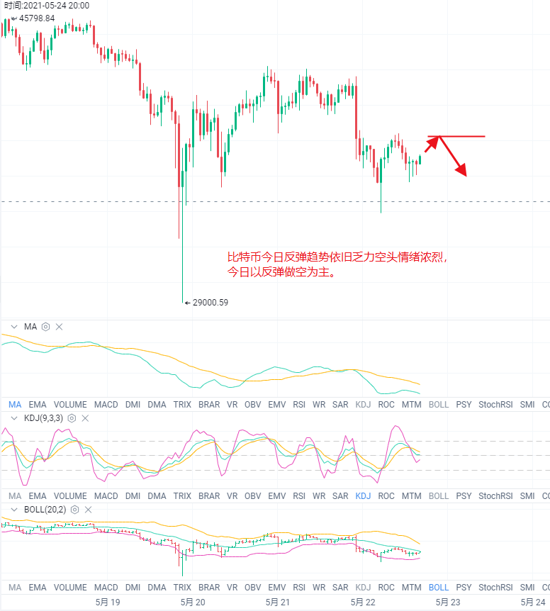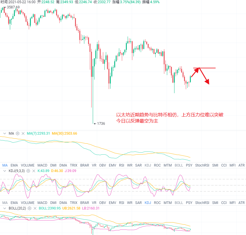比特币昨日日内整体上在40000一线上方震荡运行,虽然午间时下探至39200一线的,但随后也是快速拉升,但是上方也是始终受制于42500一线。晚间时在消息面的带动下,比特币也是再次迎来大幅回落,今日早间时最低触及到了33500一线,目前价格小幅反弹,运行在36700附近。技术面上来看,小时图上来看,布林带张口向下,行情有向中轨附近运行的趋势,上方关注38500压力位,