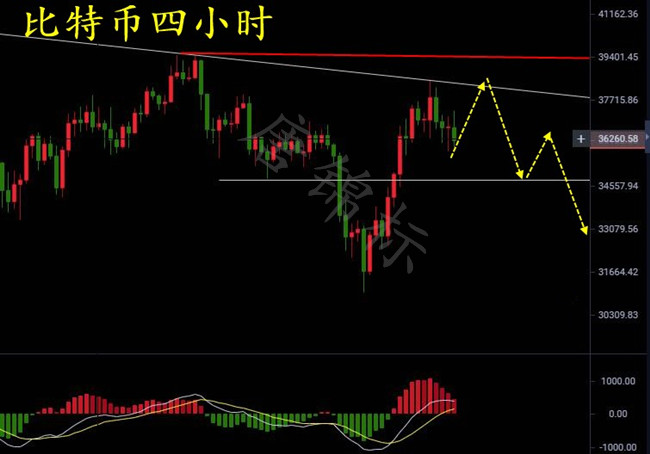 昨天行情冲高回落,最高到达38491,最低到达35700一带,目前处在36600附近震荡,四小时上,随着30000测试失败,行情V型反转,目前这一波高点已经出现,但是我认为38491不是这轮反弹高点,后市还会有一波反弹冲高,我预计会冲到39000-39500区域,或者38500形成双顶,然后回落,继而大跌,大方向还是看空不变,要回暖早该回暖了,迟迟底部震荡,只说明还要跌,只是庄家不让它这么快跌下得去,想再洗几波,对于抄底我还是之前的建议28000-29000区域。对于短线上的行情我建议先看多,在看空。