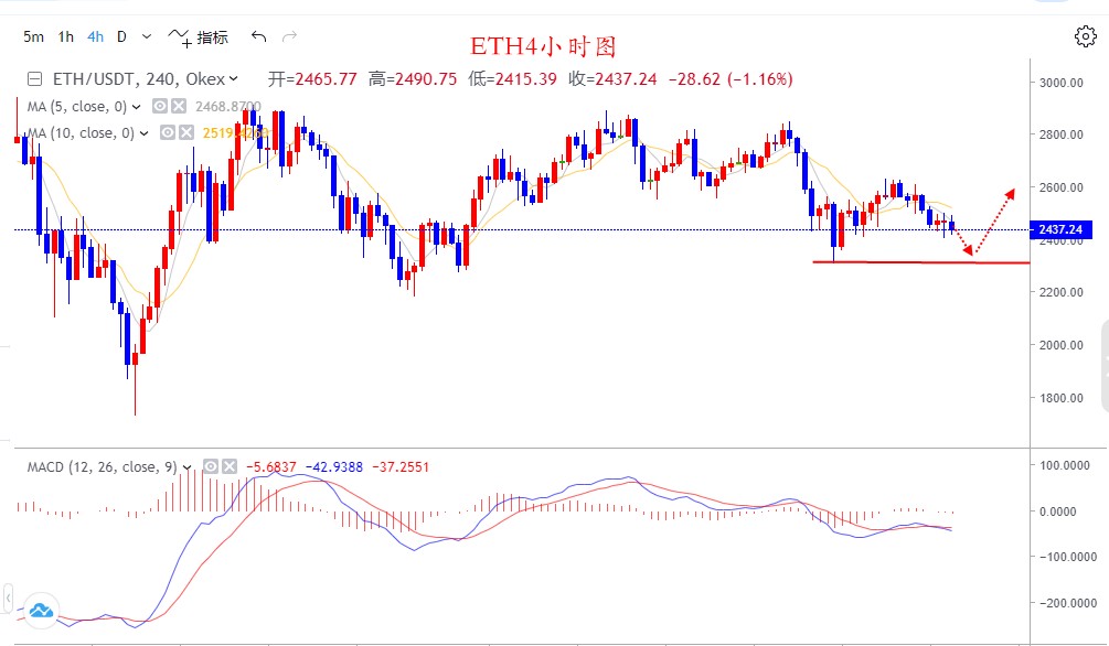 以太坊近期的走势相较于比特币而言就有点弱势了,之前行情虽有反弹,但是最终止步于2620一线行情开始回落,目前又重新回到了2500下方,直逼2400这个位置,从目前的走势来看,大家关注下该位置的支撑,可以依托该位置布局下多单,从日线上分析,以太坊经历了持续的下行后,目前处于低位震荡态势,行情已经两次试探120日均线在2300这个位置的支撑,未能进一步下破,日内走势虽有下滑,至于能否到达2300这个位置我们重点关注下2400这个位置的支撑,破位后才会有进一步下滑的动力,短线上分析,4小时线上处于空头走势,一旦破位2400-2410这个区间,行情会有进一步下行的空间,总体而言,以太坊还是较为弱势,日内依旧先看回踩,下方关注下2400这个位置的支撑,破位后下行空间将会加大。