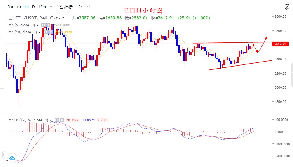 以太坊的走势也是比较活跃,自从上周跌破2400一线位置的支撑后,下行幅度加大,行情直接试探笔者之前说的重要支撑位2300这个位置,虽然刺穿了该位置,但是收线也是较为迅速,最终并没有有效下破,再次开启了反弹,说明该位置处的支撑还是较为强劲的,日线上看,以太坊近期虽然上下折腾的厉害,但是没有走出大的震荡区间,2300-2800这是一个大的循环,昨日的收线更是成功收在了布林带中轨上方,那么接下来的走势笔者认为行情依旧有上行空间,短期的回踩都是我们做多的机会,4小时线上看,布林带开始开口上行,附图指标MACD红色动能有待进一步放量,多头有待发力,小时线上看,目前依旧是一个横盘走势,横久必跌的这句话依然会得到验证,综合来看,以太坊追随大饼走势,笔者认为,行情会出现一波回踩,随后继续开始上行态势,操作上先空后多,下方重点关注2560这个位置的支撑