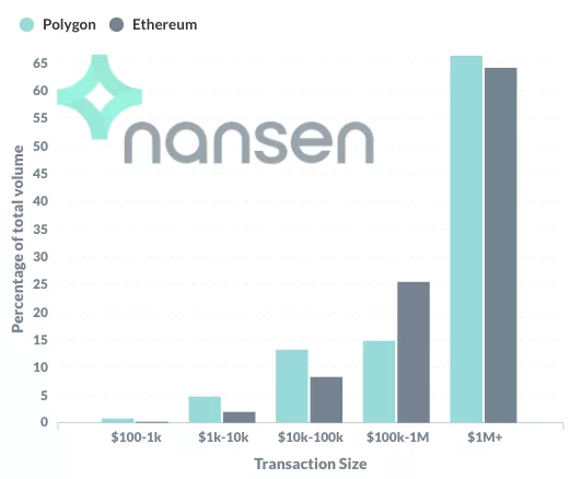根据Nansen区块链数据分析公司提供的数据来看,Polygon六月初约65%的日均稳定币交易额都是由单笔大于一百万美金的交易贡献的。