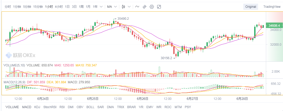 根据6月28日早盘欧易OKEX行情数据显示,比特币涨幅扩大,短线走高超1200美元,日内涨超6%,至34994美元/枚。距离35000美元仅一步之遥!
