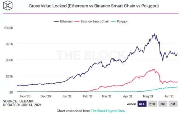 TVL(Total Value Locked;总锁仓价值)数据显示,BSC(币安智能链)是迄今为止除以太坊之外获得最多使用的平台,BSC网络中的应用锁仓的TVL达到了147亿美元。而以太坊侧链项目Polygon的TVL也以快的速度增长到65亿美元,仅次于BSC。(如下图)