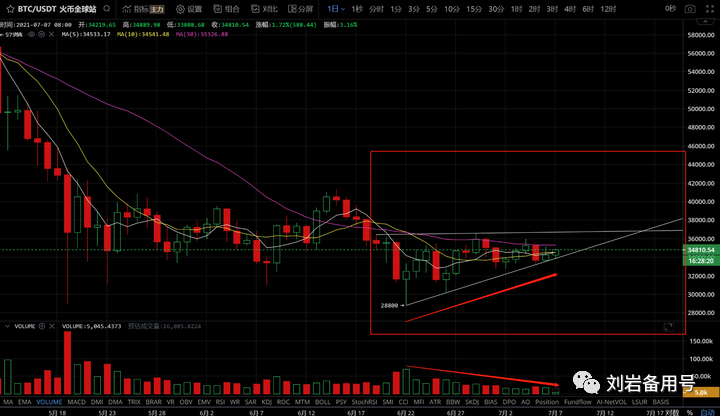 从图中币友们估计不难看出,目前比特币从28800刀反弹至今,走了一个日线级别的上涨三角形趋势。而且伴随着上面给币友分析的那些洗盘蓄势行情导致目前三线合一的迹象也是逐渐明显的了。按照此趋势,我昨天预测大盘就有可能一波放量上涨,直接完成掉一阳穿三线的走势,带起一波不错的上涨行情来的。