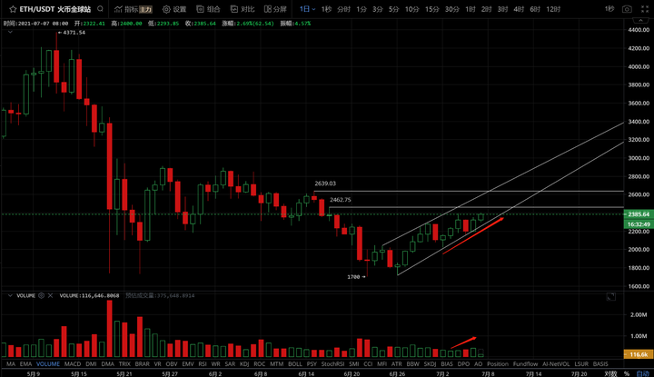 首先,以太坊在1小时周期和日线周期中都处于平行四边形的整体上涨趋势中的。上方压力位依旧是2468——2500刀、2639——2893刀区间的。而且,有一个最好的现象就是,以太坊这一波的反弹上涨量能是跟上的。