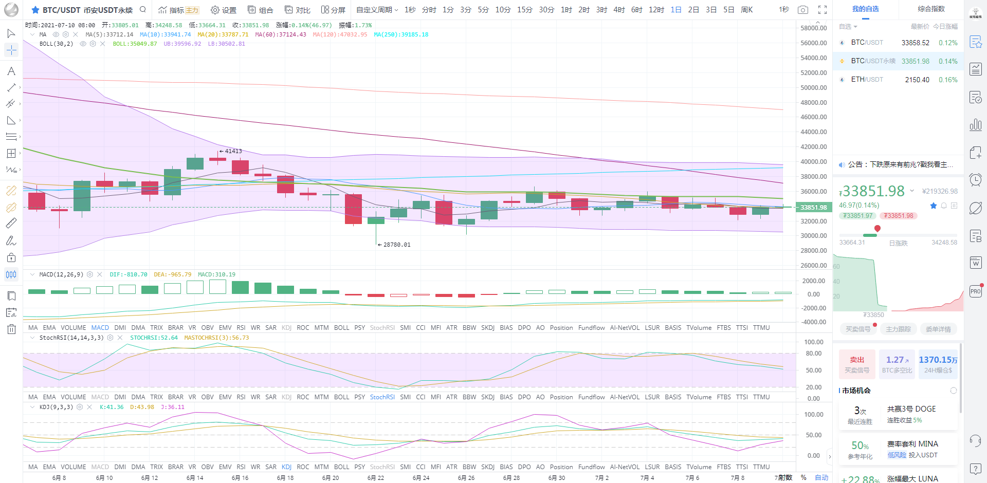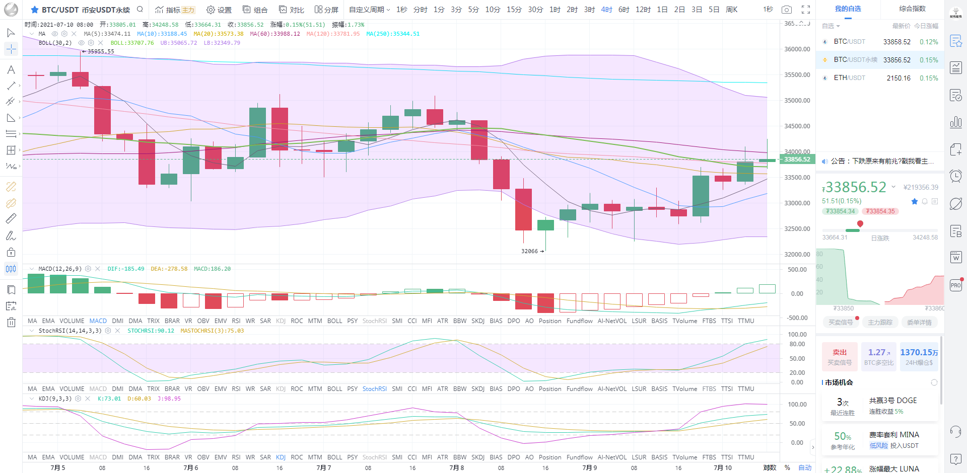 昨日比特币维持一个区间震荡,整体没有太大的浮动,直至晚间,多头开始逐渐发力,价格持续震荡上行,价格最高来到34248位置,目前价格维持高位震荡,位于33850。