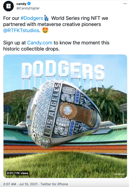 美国洛杉矶道奇队(Los Angeles Dodgers)将在下周发布其第一批球队NFT,包括带有实体世界大赛(World Series)戒指的单版NFT。该捆绑包NFT通过美国职业棒球大联盟(MLB)与加密收藏品初创公司Candy Digital、数字时尚潮牌RTFKT Studios的合作提供,于7月12日-7月15日进行在线拍卖。拍卖所有收益将捐给慈善机构道奇基金会。