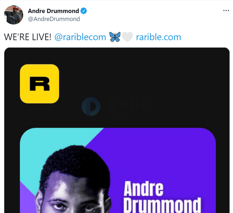 7月10日,NBA湖人队球星Andre Drummond发推宣布,其NFT收藏品已在NFT平台Rarible上线。