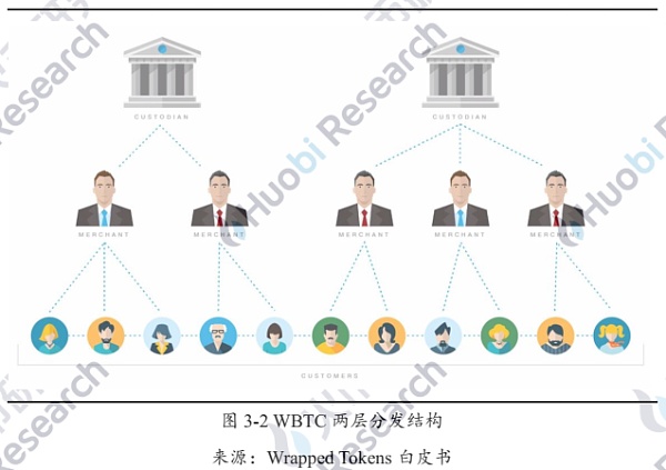 WBTC体系是基于信任的联盟治理模式,其核心为两层分发结构。如0所示为WBTC的两层分发结构,其中涉及三种角色,托管方(Custodian)、商户(Merchant)以及用户(Customer)。在该结构下,托管方与商户之间的交互负责铸造和销毁WBTC;商户与用户之间的交互负责向二级市场投放和收回WBTC;用户不会越级直接和托管方交互。