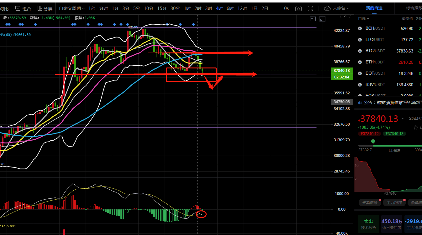 4小时上看,大饼在39700附近承压收十字星之后行情一波下跌,晚间以太的下跌带动大饼下跌,不过这波下跌虽然快,但也并没有去有效跌破下方支撑位位置,在37500-37300区间的支撑依然存在,给到支撑后行情反弹,不过这一支撑我个人认为晚间是会去跌破的;盘面技术指标上看,布林带向下运行,向下开口,均线也开始拐头向下,短线的反弹暂时还不能改变空头趋势,附图上MACD死叉形成,晚间我们看跌破;