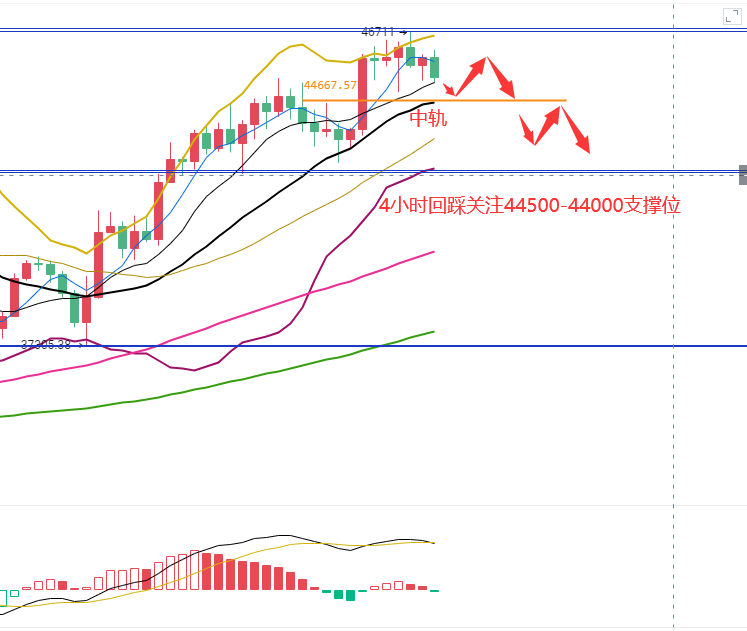 4-1小时级别:目前4小时高位背离形态已经出现,唯一我们需要考虑的是主力是否再次拉升洗盘,背离看回落没毛病,这也是反复提示大家不要去追多的原因所在。晚间回踩要关注布林带中轨44500一线的支撑位。此位置也是前期平台位置附近,小时图中期均线支撑位在44000附近。