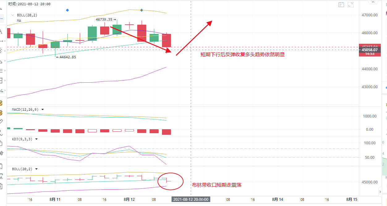 4小时下探后并未立刻出现反弹收付失地,而是围绕45000上方开始小幅度震荡,短期给到的反弹力度并不大。预计短期会走一个震荡上行趋势,小时图双底回升,目前下方支撑44500一线稍显强势,连续四次下探均为突破这一位置。目前四小时布林带开始收口,大概率短期又将延续震荡,日内操作上建议围绕震荡区间进行低多操作不变。