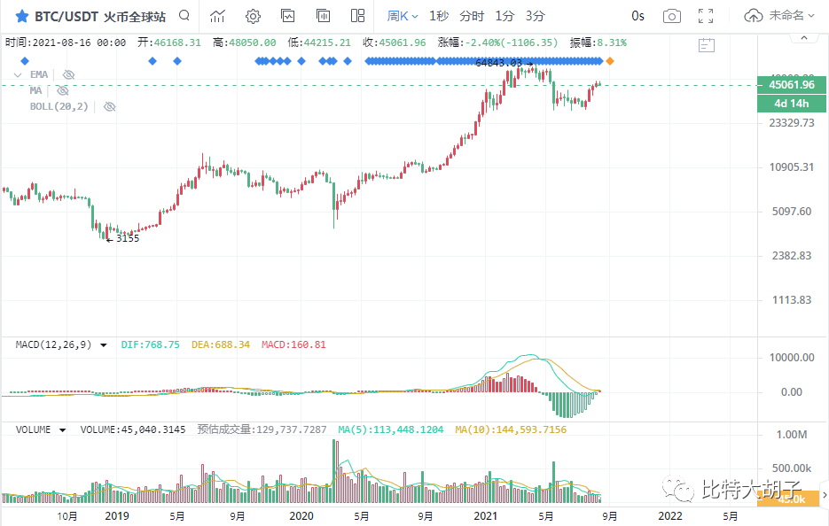 周线上面,这里整体上面还是没有改变,继续寻找三买点位置,进行周线的继续冲高达到55000位置再去回撤,