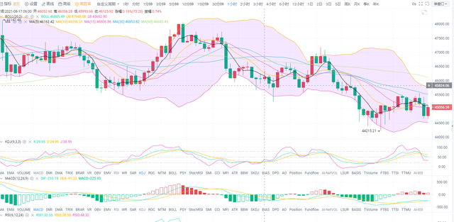 日内开盘后延续空头趋势,目前行情破位45000一线,价格在不断走低,日线图已经走出四连阴,行情仍有进一步下探空间。小时线来看布林带缩口向下,K线价格沿布林带下轨不断走低,目前币价在45000附近。副图指标MACD快慢线金叉粘合状态,多头能量柱持续缩量,KDJ三线拐头下行,整体行情处于空头趋势,操作上建议空单进场。