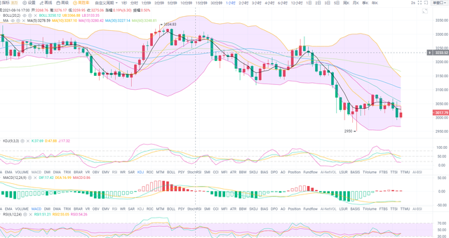 以太坊早间币价下行突破3000关口,一举回落插针至2950美元后反开始反弹至上方3084美元后再次承压下行;半小时来看布林带处于平行通道,k线处于EMA15压力位下运行;1小时来看布林带通道下轨线抬高,k线处于EMA15与中轨线双压制下,KDJ向上拐头,MACD 0轴上方动能柱继续持量,RSI三线交叉上行,MA5、MA10、MA15日均线底部交叉向下,MA30、MA60日均线继续保持下行趋势;4小时来看布林带向下开口,k线处于下轨线附近向上试,MACD 0轴下方动能柱缩量上行,KDJ向上即将形成交叉,RSI三线拐头向上,MA10-MA60日均线交叉下行,晚间下方继续EMA120支撑情况;综合上述指标来看,晚间可参考回撤不破做多思路,反弹上方不破做空即可