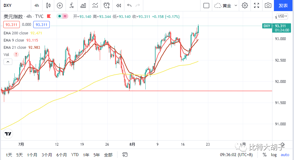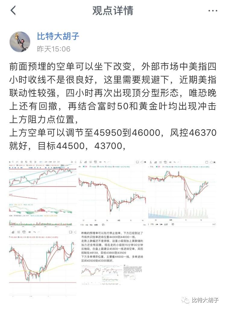 前面也是提示了一下美指方面四小时段会出现回撤风险,所以空单的位置上面做了调整,当时也还好去进行了进场,晚间由于美联储纪要的发布,美指上破阻力点位置93.2一线,比特币也是跟随呈反向走出下探一笔,目前已经达到第一减仓位置,下方可以继续关注43700一线,
