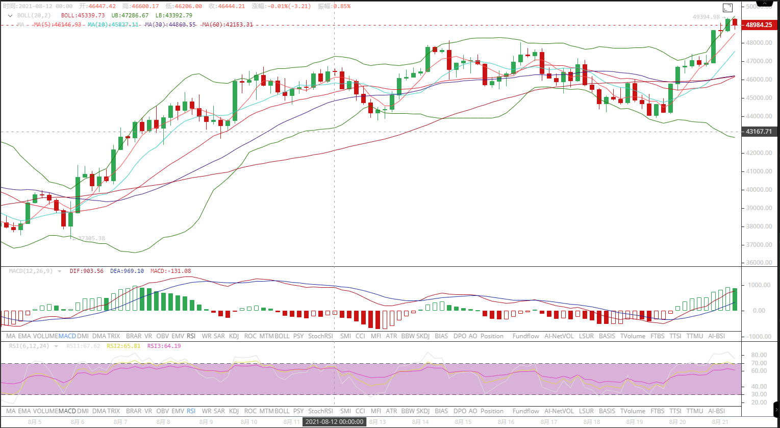 比特币价格昨日晚间再次强势拉涨,价格破位关键压制48000位置后一路上行,最高触及49394位置,目前价格短线回落,运行于48973位置,但整体还是偏向上行。
