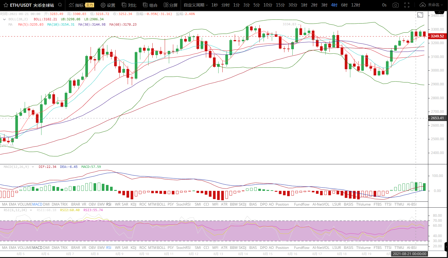 以太坊价格昨日上行触及3300位置后走出回落,随后于3210附近受到支撑,价格走出反弹,目前价格运行于3250附近。4小时图上看,目前价格维高位震荡格局,布林带目前呈现开口上行走势,价格目前仍是运行于布林带上行通道内,不过5日均线目前逐渐走平,价格短线预计将延续震荡。日内后市策略上建议回踩多单为主。下方关注3220-3200附近支撑。