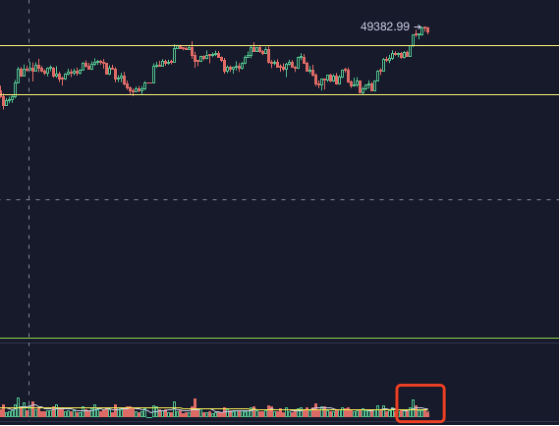 目前震荡已经半个月左右了,要说方向的选择,也差不多该出了。这半个月内都是一直在一个4.4w-4.8w之间的矩形区域内进行震荡。昨晚第一次放量突破4.8w,我们可以顺势做多,目标5.2-5.5w,止损放在48000以下3%,跌破44000,继续看回调。昨晚没介入的,日间可能有回踩,可以介入。