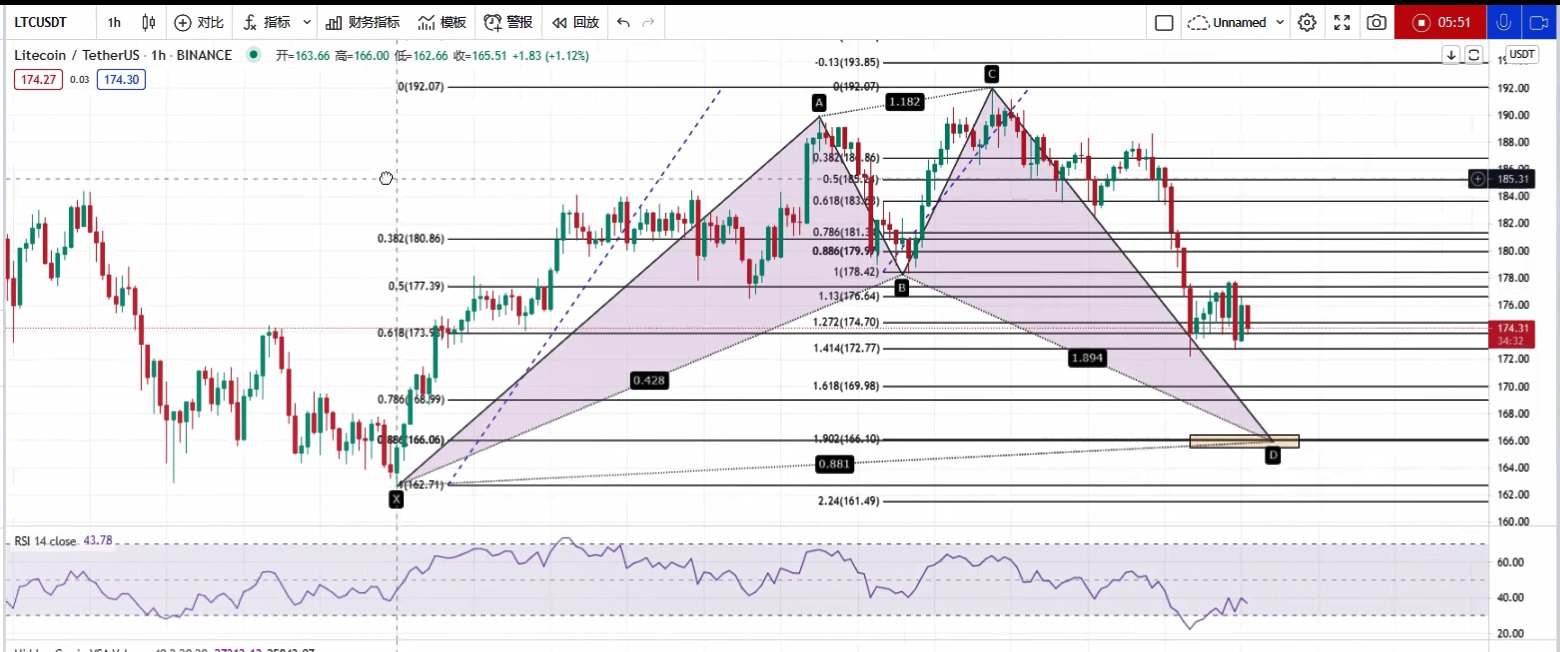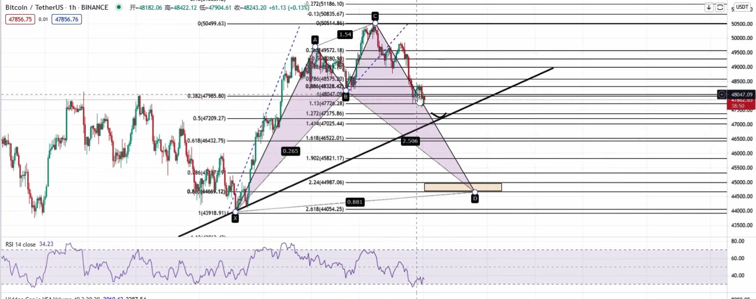 第2种可能是回调到44000左右的价格,完成鲨鱼形态,