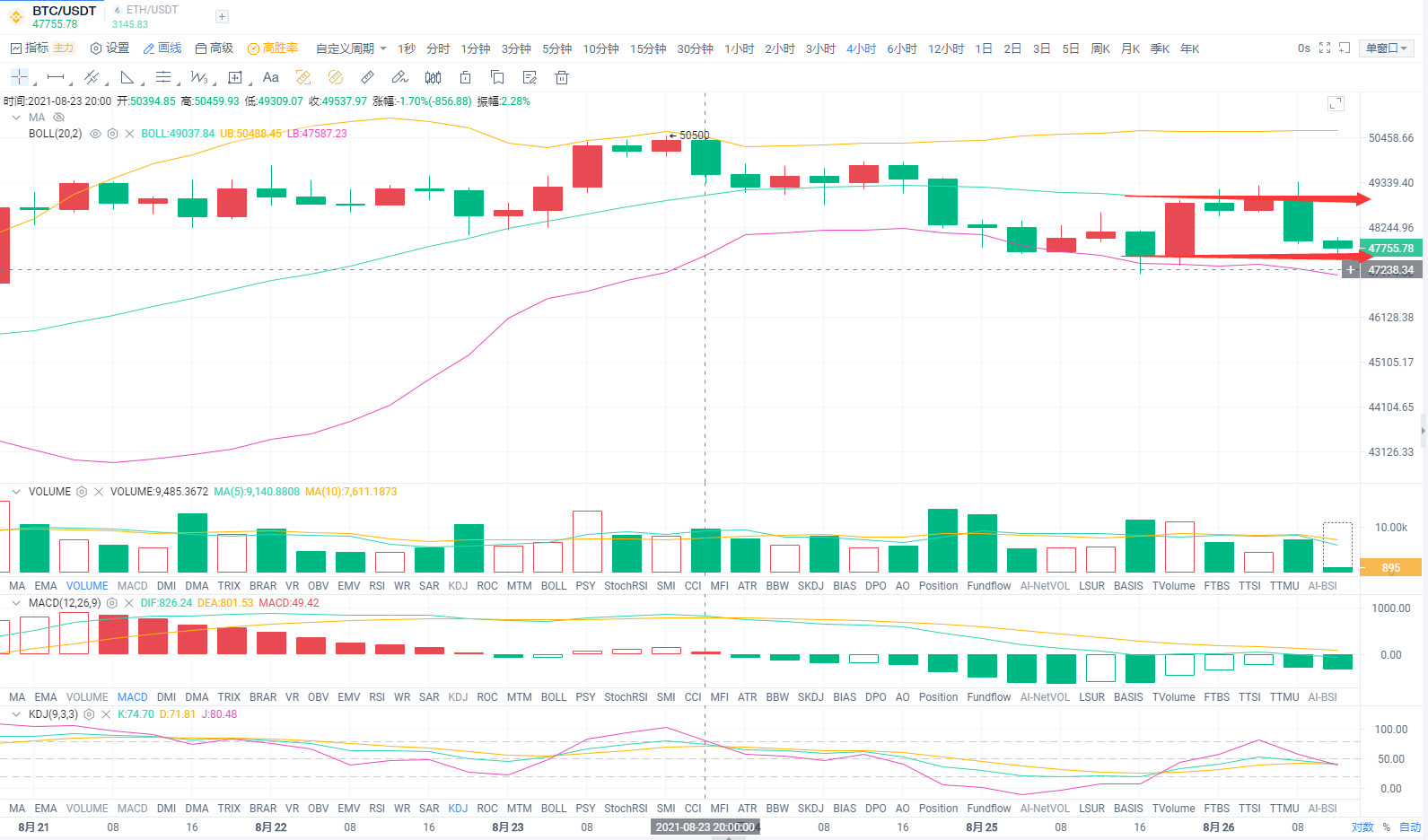 从4小时级别线来看,布林带收口收平,另外,目前的走势还是收到中轨的压制。下方支撑已经站稳47500美元。