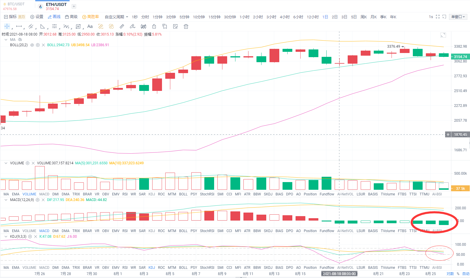 从日线级别来看以太价格跌破布林带中轨支撑,KDJ死叉形成在50轴下方运行,MACD绿色实体量能放量增量运行。短期4小时级别来看,在8.25零点后一直在布林带下轨运行,并且KDJ死叉即将形成。