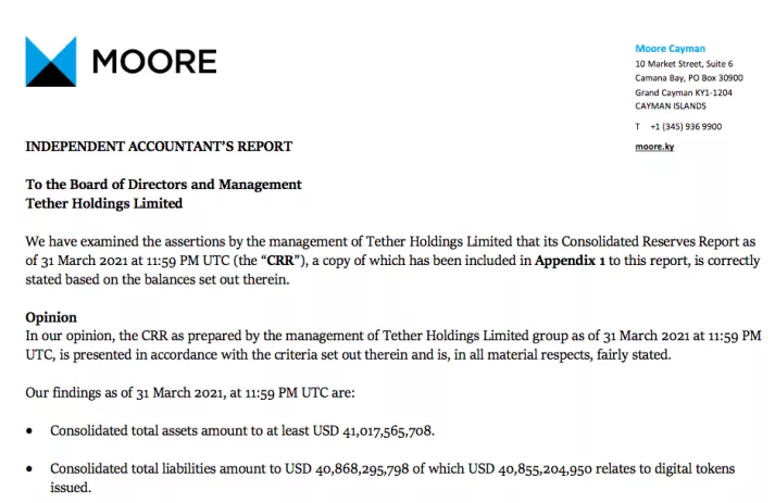 Moore Cayman 发布的USDT储备金审计报告