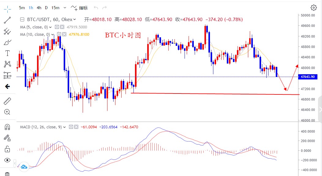 从技术面上来看,明天月线收官,本月的走势无疑为市场增添了活力,大部分投资者又再次纷纷进场,比特币毫无悬念的本月会再次收阳,下个月多头有待继续发力,月线上走势还是较为强势的,热线级别分析,月底最后几天行情有所墨迹,处于一个高位盘整的态势,随时破位,这也是很多朋友没有现在进场的原因,从日线上看回调的可能性比较大,多头有着明显放缓的迹象,4小时线上看,比价并没有突破47000这个关口,多头还是占据优势,大家都知道行情要涨,但是笔者认为行情不会直接拉上去,还是有回踩需求,日线上的回踩态势也较为明显,今明两天的收线情况尤为重要,小时线上看接连收取两根带下影线阴柱,下行支撑较为强劲,所以综合来看,短期内行情有待继续上涨,大家上方关注48300-48500这个区间阻力,有效站稳后行情会继续上行,但是上方空间也别指望有多大,在出现大幅度上涨前行情势必会有波调整,做现货的朋友请大家耐心等待下,后面还是有机会进场的,不要着急,短线操作上,日内预计先反弹后走回落,大家把握好节奏。