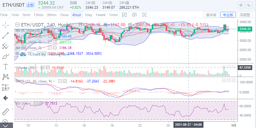 以太坊价格早间回踩触及3188位置低点后,价格走出反弹,随后价格维持在3200上方震荡,目前短线来说,价格仍是缓慢攀升的可能。上方短线的压制可以关注3250一线位置,后市若能破位则可以关注3280一线位置的可能。不过目前的大饼走势较弱,以太坊方面也不能太过乐观。所以操作上我们仍是以反弹空单为主,低多为辅。