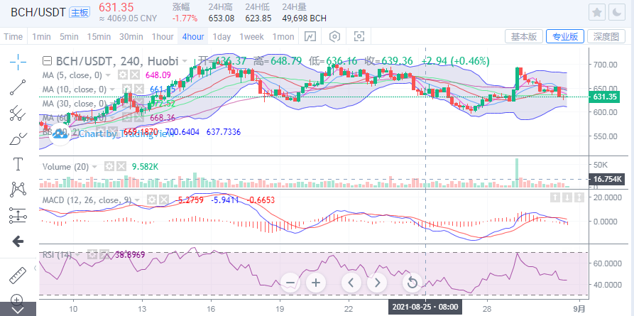 BCH早间跟随大饼下行之后,目前维持在630附近震荡运行,4小时图上看,价格目前运行于布林带下行通道内,布林带的走势目前微微开口下行。5日均线目前向下压制价格于637位置。附图指标上看,MACD目前死叉下行。整体来看BCH后市价格预计仍是会再次下行,操作上建议反弹空单为主,上方关注637-640一线位置压制,其次关注650位置压制。