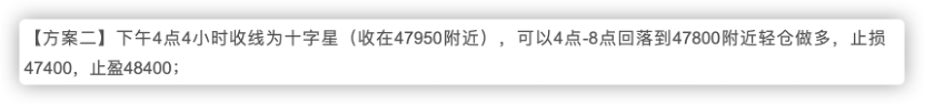 【方案一】在各位看到稿子后,如果已经跌破46700,那么再次反弹到46700-46800附近做空,止损放在47200,止盈看下方46000;