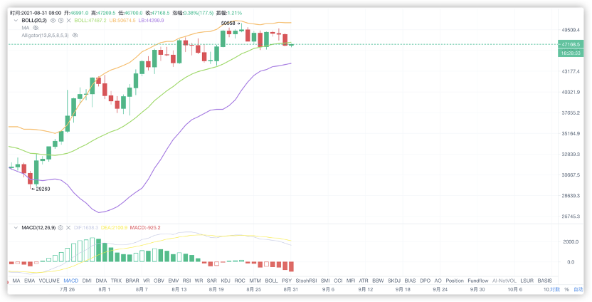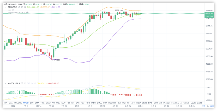现在来看日线跌破了布林带中轨,不算太深,同时MACD也在放量下跌,如果BTC还想往上涨,那么在明天早上8点前需要重新站上布林带中轨的上方,但目前来机会比较小。
