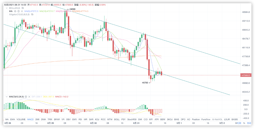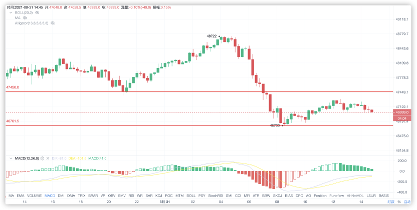 我们在回来看看15分钟图走势,目前来说自下跌之后,一致是处于一种弱势震荡的情况,那么也是验证了我们所说k线在等待指标修复,上方压力位是47400附近,下方支撑位置在46700附近。