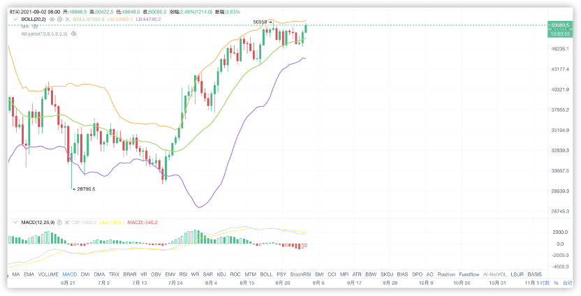 我们在8月31日的马后炮中就有说,很可能ETH会进行一波拉升,把BTC顺带拉升到50000上方,也正因为这个想法所以我在31日夜间发布了一个信息让大家在47800做多,止损47600,止盈看50000,也是这样想法所致,当然最后这个单子最后是止损了,这也是我昨天没发文的原因,因为昨天的局势并不适合短线单子。