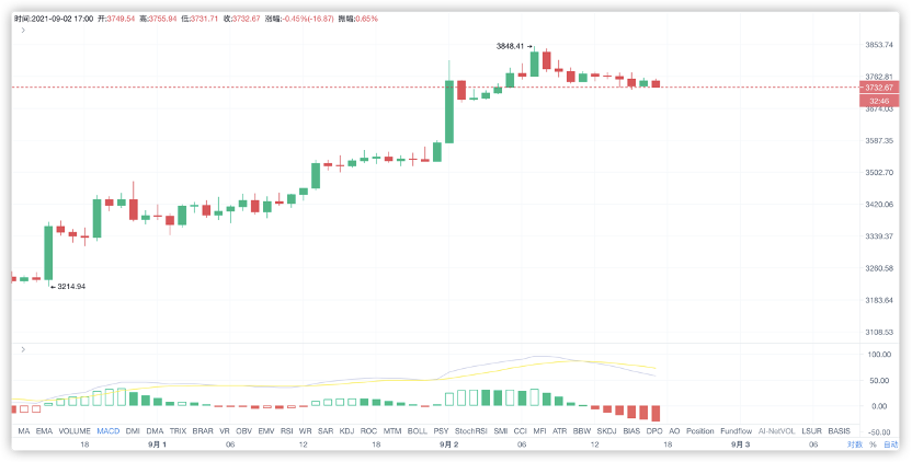 我们直接看小时图,目前来看ETH又是处于高位横盘整理,下方支撑位置同样并不明显,大约是在3700附近。在目前来看ETH的上涨势头并没有完全释放完毕,很可能在今晚还有一波上涨。