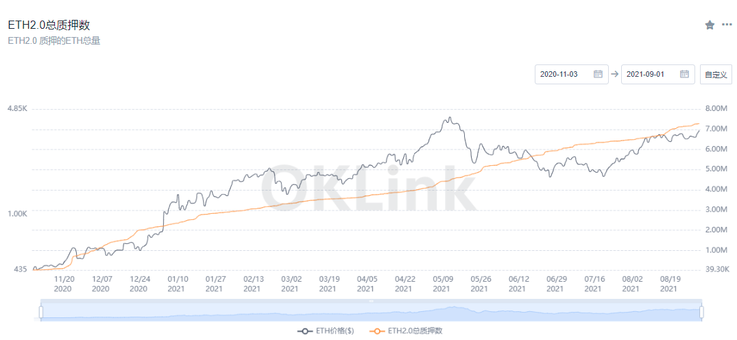 在ETH2.0的质押总量上也有相似的趋势,据OKLink统计数据,当前ETH2.0质押的ETH总数已经达到728.9万枚,占到ETH流通总量的6.23%,而且该数量仍在持续上涨过程中。