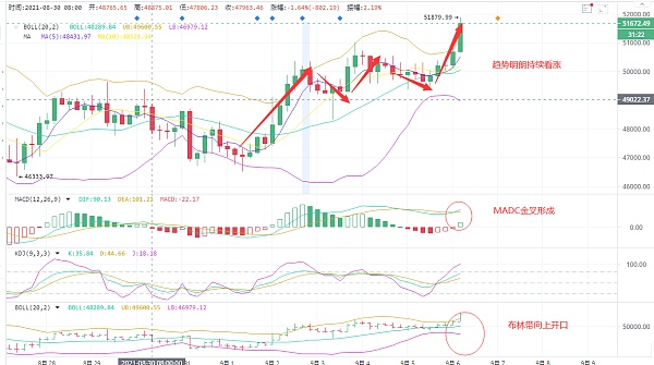 4小时经过前几日的整理蓄势,完成了压力的收复突破,打破了区间震荡,重新去强势摸高,但这波上涨继续延伸多头,4小时连阳拉动向上。形成金叉,短期回踩即是给到进多机会,一旦放量后尽量不追。今日支撑在50000处。若是直接强势突破52000高点,则尽量不在高位再去追单。谨防快速的冲高回落风险。日内思路依然维持低多不变