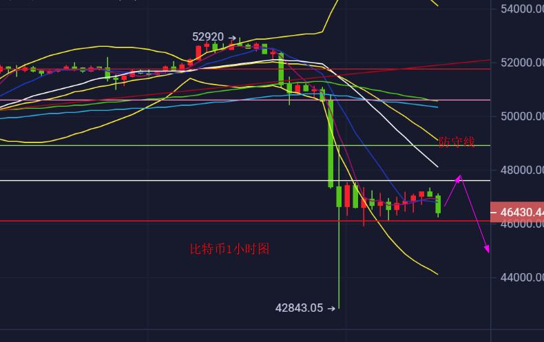 昨天大波动之后,凌晨小范围的整理,今天白天的支撑点在46200-46000区域,也就意味着短线亚欧盘会走反弹,不能急着追空,做空的考虑我认为要放在47300之上,比特币暴跌后凌晨的反弹之后,暂时不会轻易的进入大幅的跌势,但是47500-48000区域的压力我不想再过多的解释,明白人自然明白,不明白的人永远不会懂,睡着的人好叫,装睡的人难醒。先看反弹然后再回落,周线和月线一天就被大破位,尤其是月K线MA5、MA10形成了死叉,而周线MA5已被跌穿,暂时就不要再去考虑多了,即使是有反弹,但做多的风险是真的大!现在46000附近或会走一段时间的修正,反弹之后刚好到压力点,趁这个时间空窗期修正很正常。