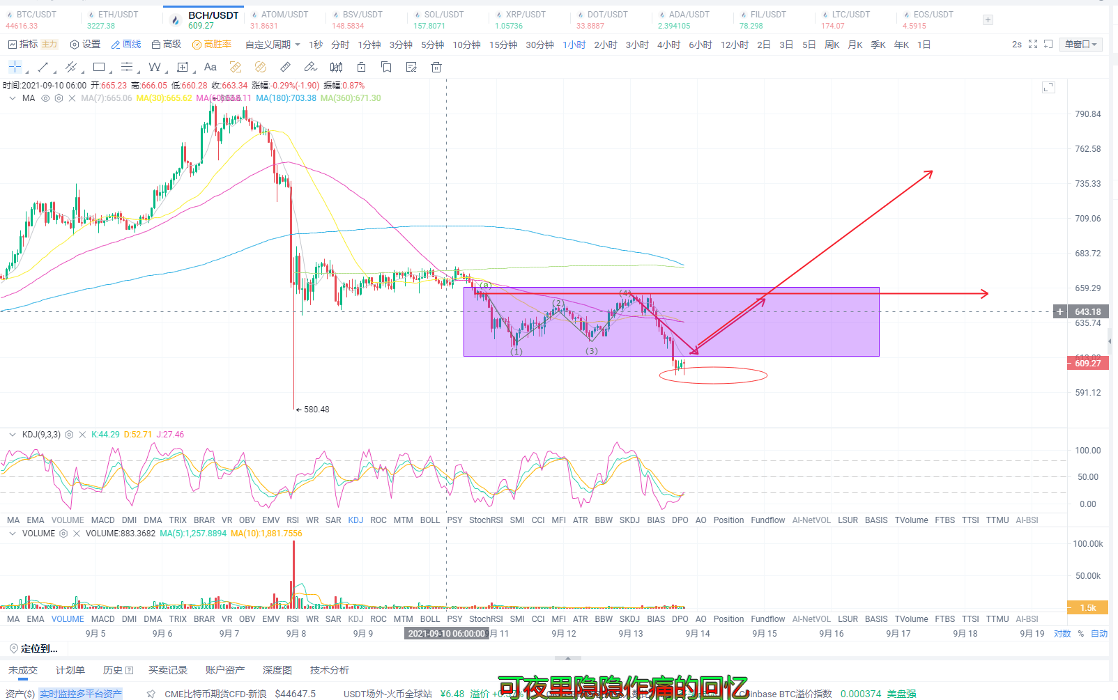 太子今日踏破了它自我形成的箱体位置所在,最低来到了601又开始回到了他的箱体当中,所以从趋势上面来看多空还是处于争夺当中 ,晚上如不能突破613则空头力量占主导,如果突破箱体前沿则多头占优,可以613选择进场多还是空, 不管出现何等方向 都是一波不小的行情的,可以重点关注一下