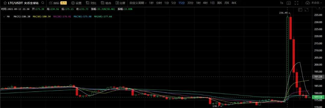 此时LTC已经从最高点回落到204,其他主流币包括BTC、ETH在内均在此刻跌破了21:30上涨前的价格。