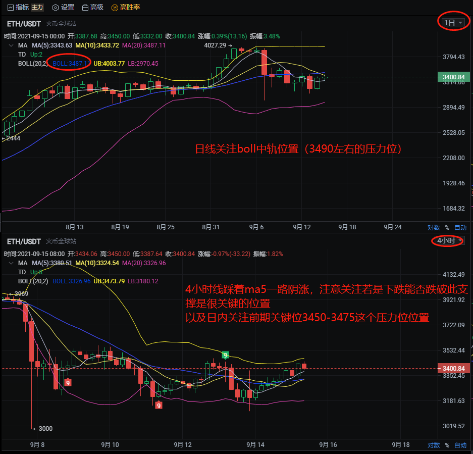 日线看币价运行布林带下轨区域,目前接近布林带中轨,故此目前首先参考布林带中轨(3490附近)作为日线的压力位参考,ma5有拐头向上的迹象,也要预防一根阳线直接拉上去突破中轨也就是空单该止损的时候。4小时图看连续k线踩着ma5阴涨上去,目前受到前几天的交易密集区—(3450-3475)压力。也可以作为目前的空单入场点参考。个人建议今日不要去追多,以高空为主。但是不能无脑空。损还是必须要带的。具体的可以看微博视频讲解