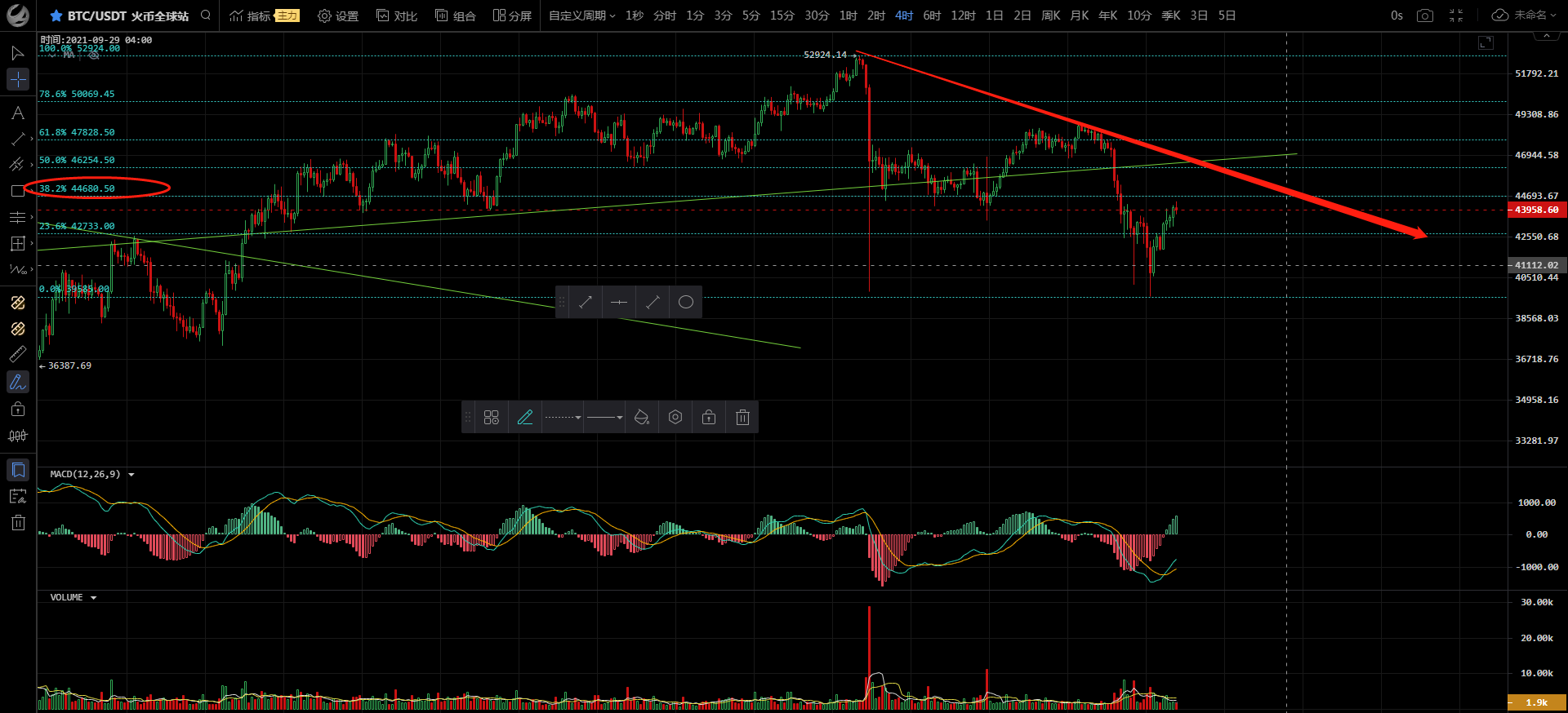 比特币昨日白盘一路下行,随后晚间日线收线收阳,结合前日组成双针探底结构,今日白盘先看反弹随后大方向依然存在再次下探可能性,日线裸K结构上要注意是否会走出启明星,恭喜跟上昨日空单思路的朋友,总计三个位置获利两千余点,今日收线阳线,那么多看少动,大主体结构指引空,日线裸K指引反弹,当前来到38.2附近,重点关注四小时周期均线向上形成金叉,MACD多头逐步放量,KDJ指标处于高位,日内关注上方压力44600-45000,下方支撑43300-42700