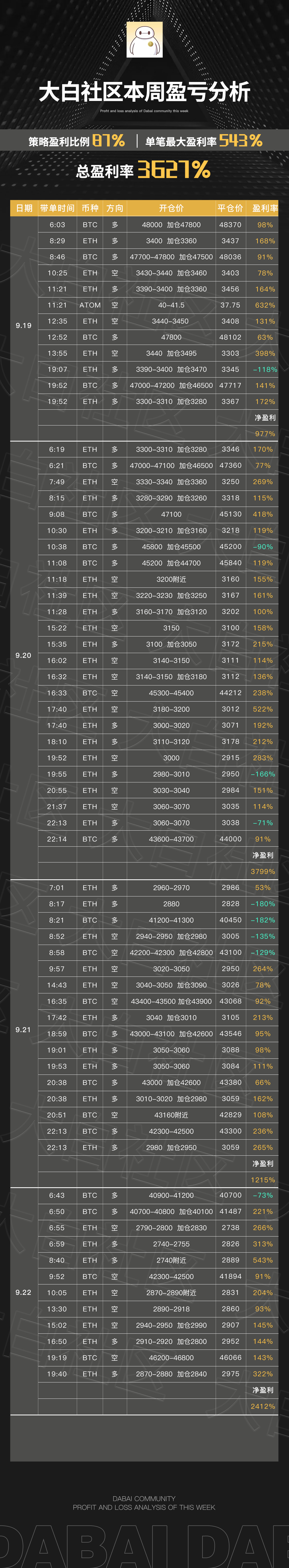 下方是大白社区本周实盘群单子,恭喜跟上的币友,如果你操作不顺,可以来试试水。