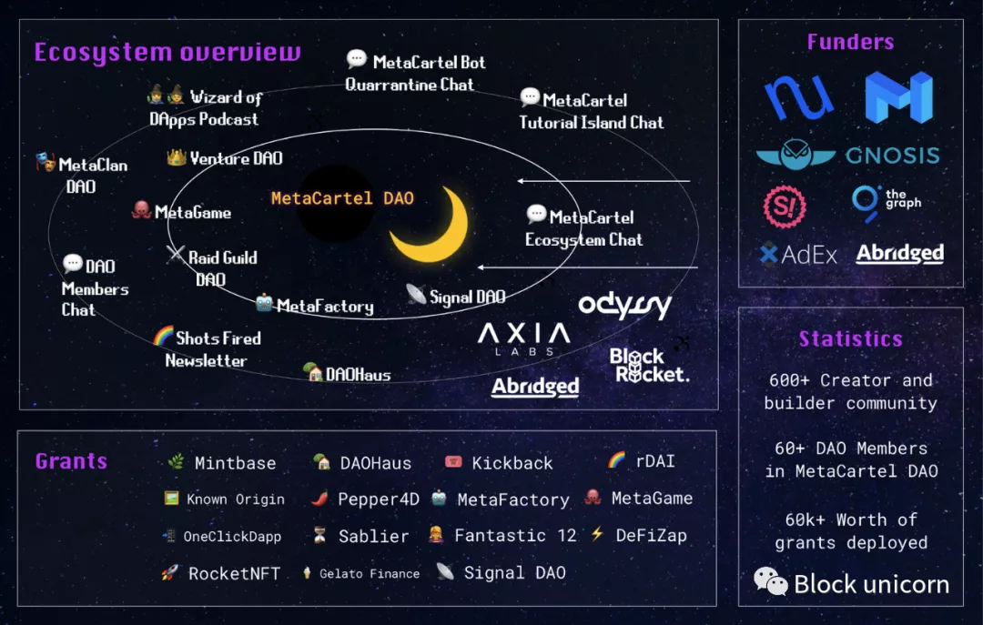 DAO 将 Aave、Nexus Mutual、Ocean Protocol 和 Axie Infinity 的首席执行官视为成员。其中一个孵化了 Raible、Gelato Network 和 DAOHaus。那是Metacartel为你。DAO 是在 2017 年之后的熊市中成立的,旨在建立一个由创始人和建设者组成的生态系统。个人进入 DAO 本身的成本约为 10 ETH,机构则为 50 ETH。这为 DAO 带来了资金,同时管理了谁购买了交易流。仅凭钱是无法进入的。个人应该向 DAO 推销自己,并获得足够的支持才能成为成员。DAO 本身很乐意成为早期组织的第一个检查员。加入 DOA 是一个许可的过程,需要成员的共识,但退出是未经许可的。离开 Metacartel 的个人按比例获得 DAO 持有的资产份额。成为风险基金只是 Metacartel 所做的众多事情